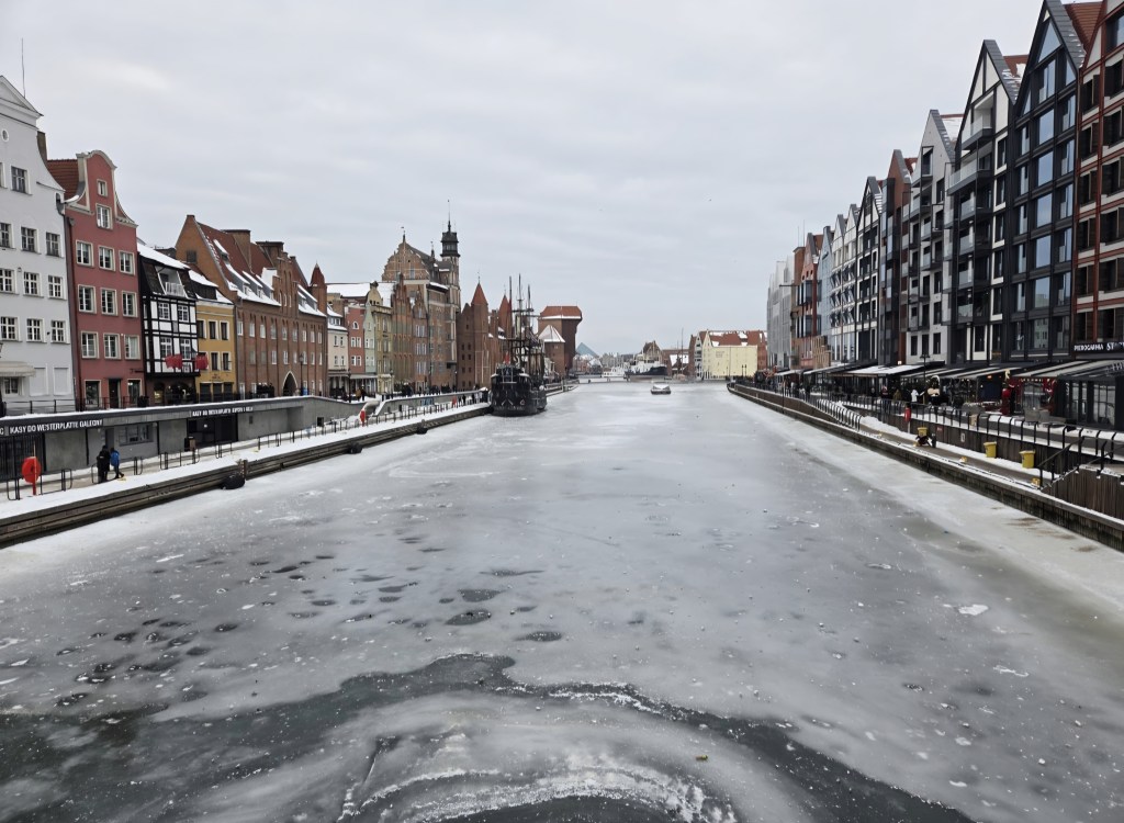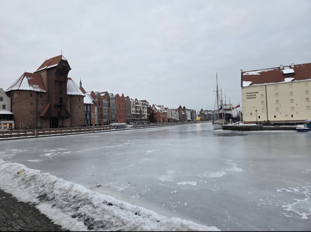 Mróz stoi na brzegu jak latarnia ludzka. Za nim żuraw i kamienice tworzą scenę, teatr zimy. Motława zamknięta w lodzie przypomina pradawny pergamin.
