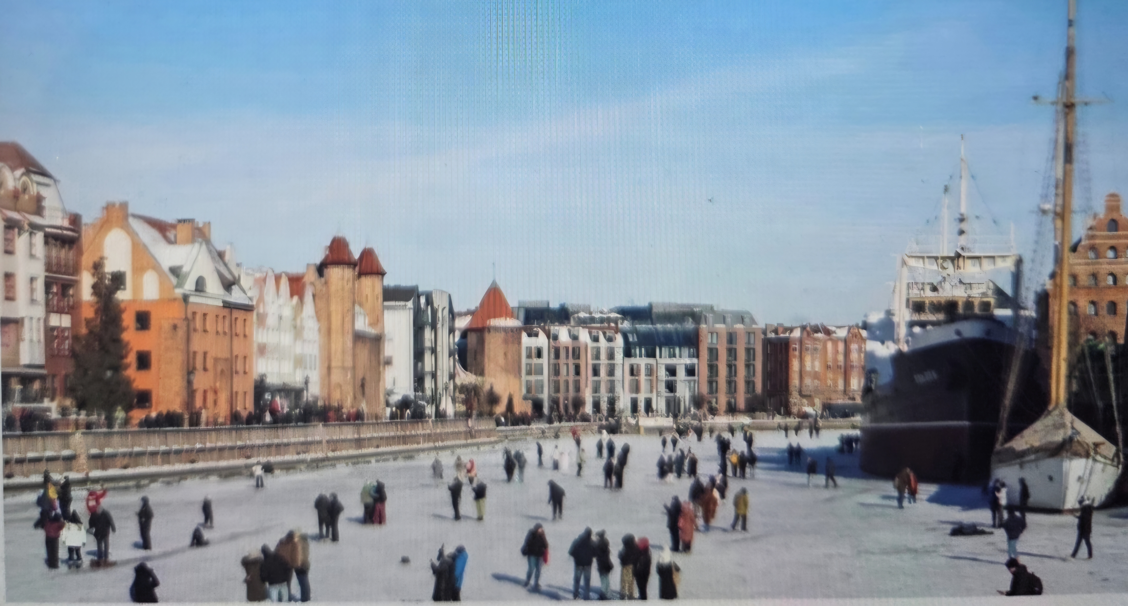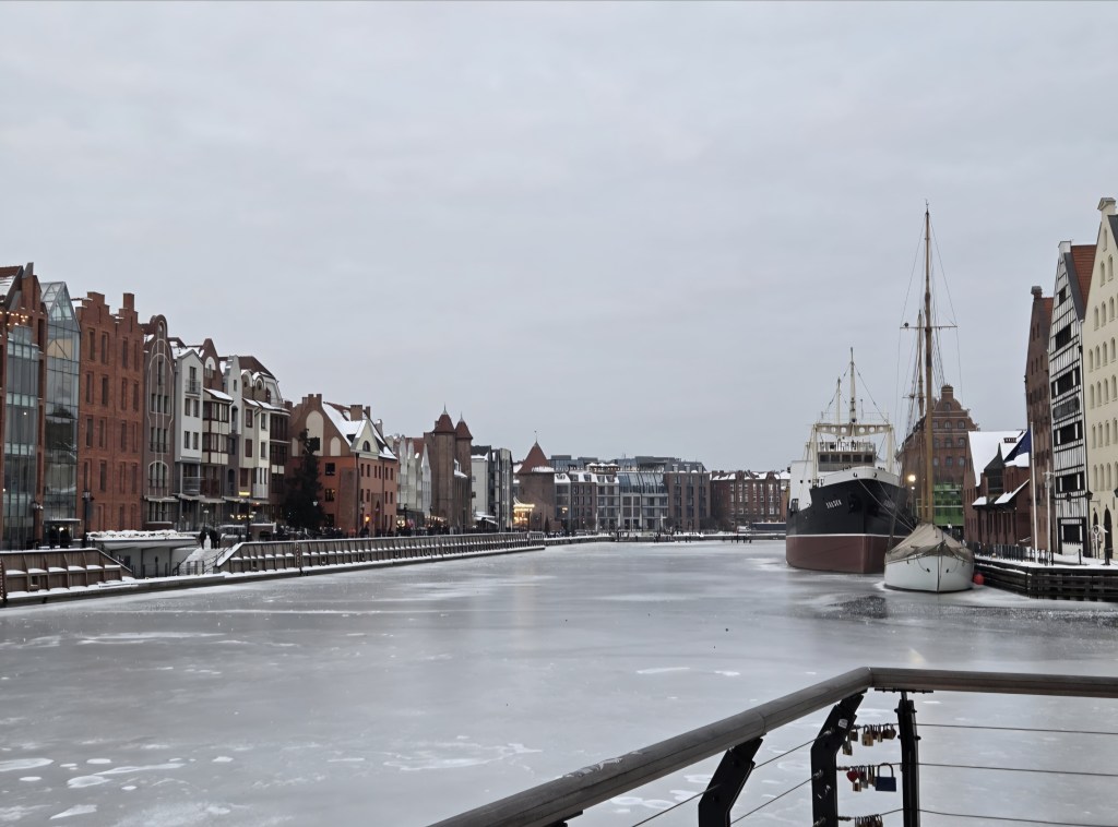 W białej czapie, jak w koronie północnej królowej, stoi Strażniczka Lodu, Zima. Za jej ramieniem wznosi się żuraw , drewniany strażnik pamięci, który pamięta sól, bursztyn i powroty żaglowców. Motława zastyga jak lustro czasu, a kamienice nad wodą przywdziewają śnieżne ramiona.