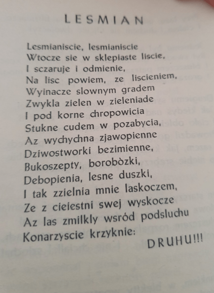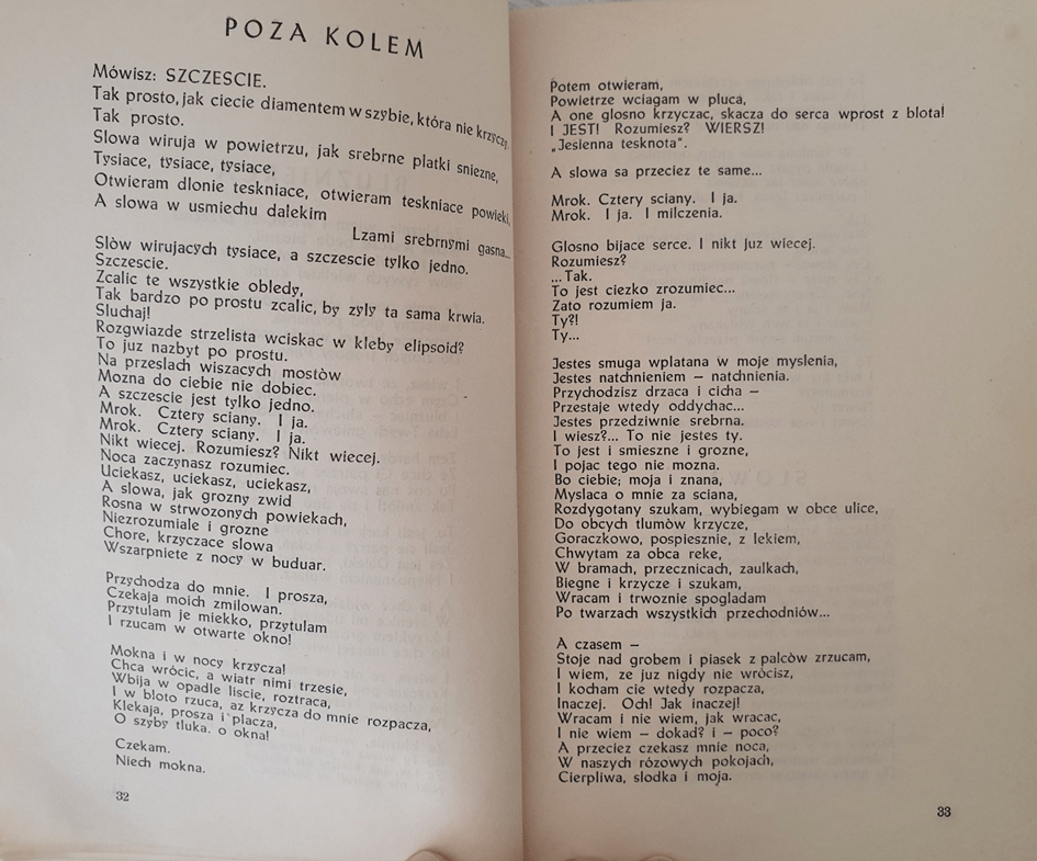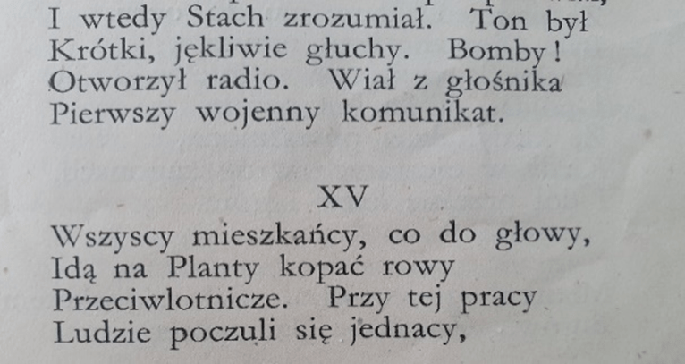 Z pewnością jakieś pokolenie pozbywało się tego zbioru przodka-bibliofila, ponieważ książki, które znalazłam, były wydane między 1939 a 1946 rokiem. Język polski, czcionka – tylko częściowo polska i nie do końca czytelna, teksty wierszem, a nazwiska autorów zupełnie mi obce.