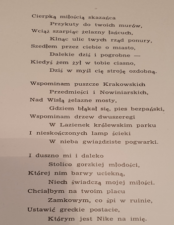 W tych słowach zawarta jest nie tylko tęsknota za ukochanym miastem, ale także próba ratowania siebie, swojej tożsamości, w obliczu brutalnych realiów obozowej rzeczywistości. Autor starał się ocalić nie tylko wspomnienia, ale również swoją godność – od rzeczywistości, która z niego czyniła jedynie cienką postać, zredukowaną do „pasiastych” więźniów, gnębionych przez obozowych oprawców, zmuszonych do pełzania w kierunku śmierci.