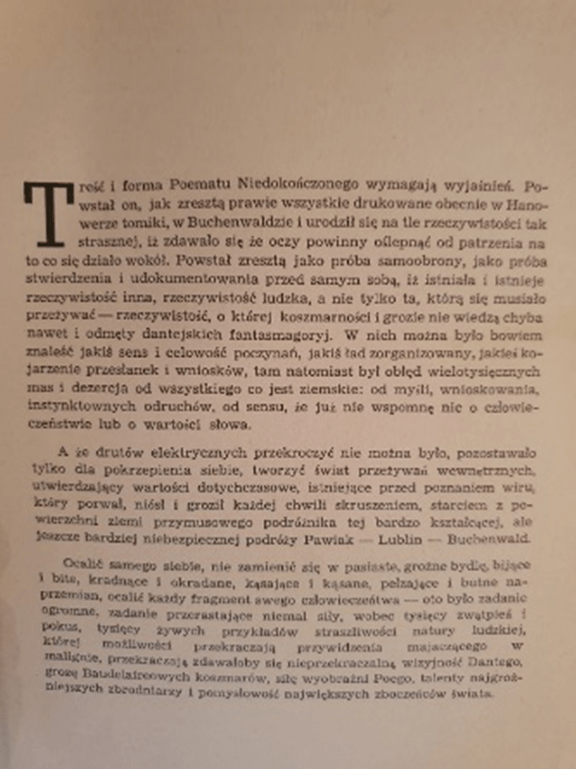 Autor porównuje Buchenwald do piekła – miejsca, którego koszmaru nie oddadzą nawet najstraszliwsze wizje Dantejskich czeluści. Jednak wbrew temu, co miało go unicestwić, ocalał. A wraz z nim – jego poezja, będąca dowodem niezłomności ludzkiego ducha.