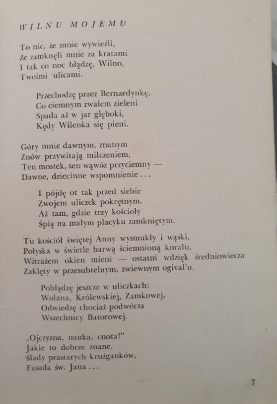 Czerwone i białe – te wiersze poświęcone są pamięci utraconego Wilna i dramatowi życia w obozach. Wilno jawi się tu jako symbol rodzinnego ciepła i szczęścia, nieodwołalnie utraconego.