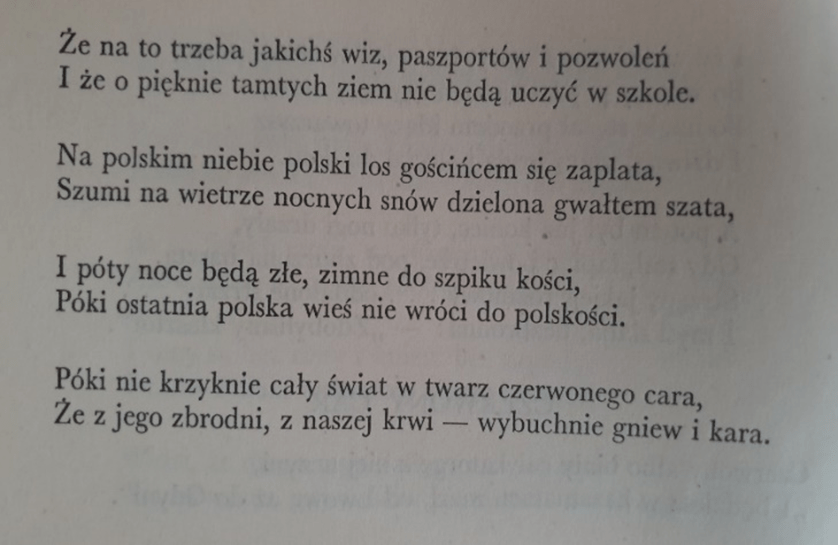 Nie sposób pominąć patriotycznego manifestu Władysława Broniewskiego – Bagnet na broń, który wpajano nam niemal jako obowiązkowy hymn pokolenia. A wiersza Żołnierz polski musieliśmy uczyć się na pamięć – „наизусть”, jak to mawiano wtedy.