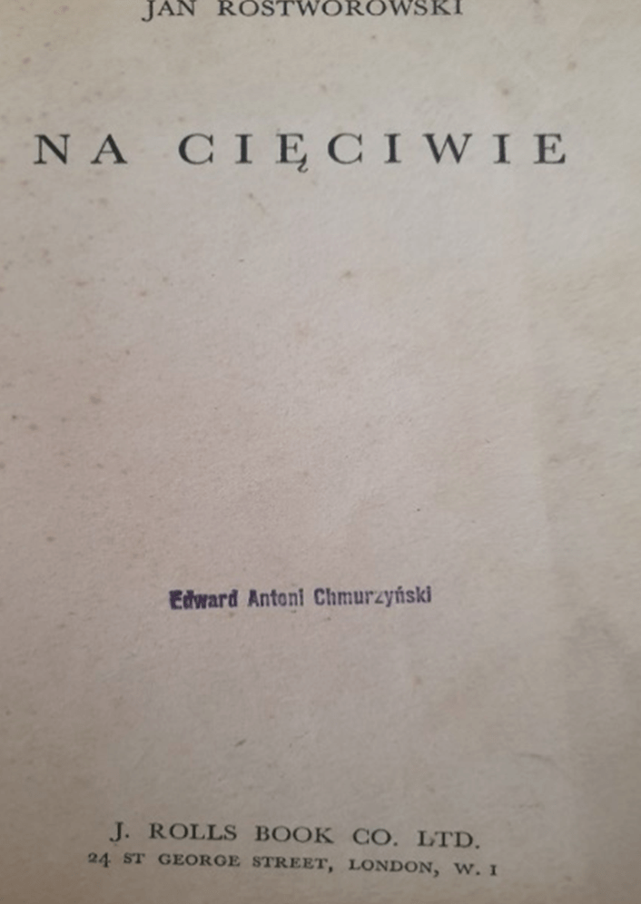 Na wielu tomikach widnieje kolorowa pieczątka „ Księgozbiór Ewd. A. Chmurzyńskiego. ( Foto nr 1, pieczątka w książce Jana Roztworowskiego, Na Cięciwie)