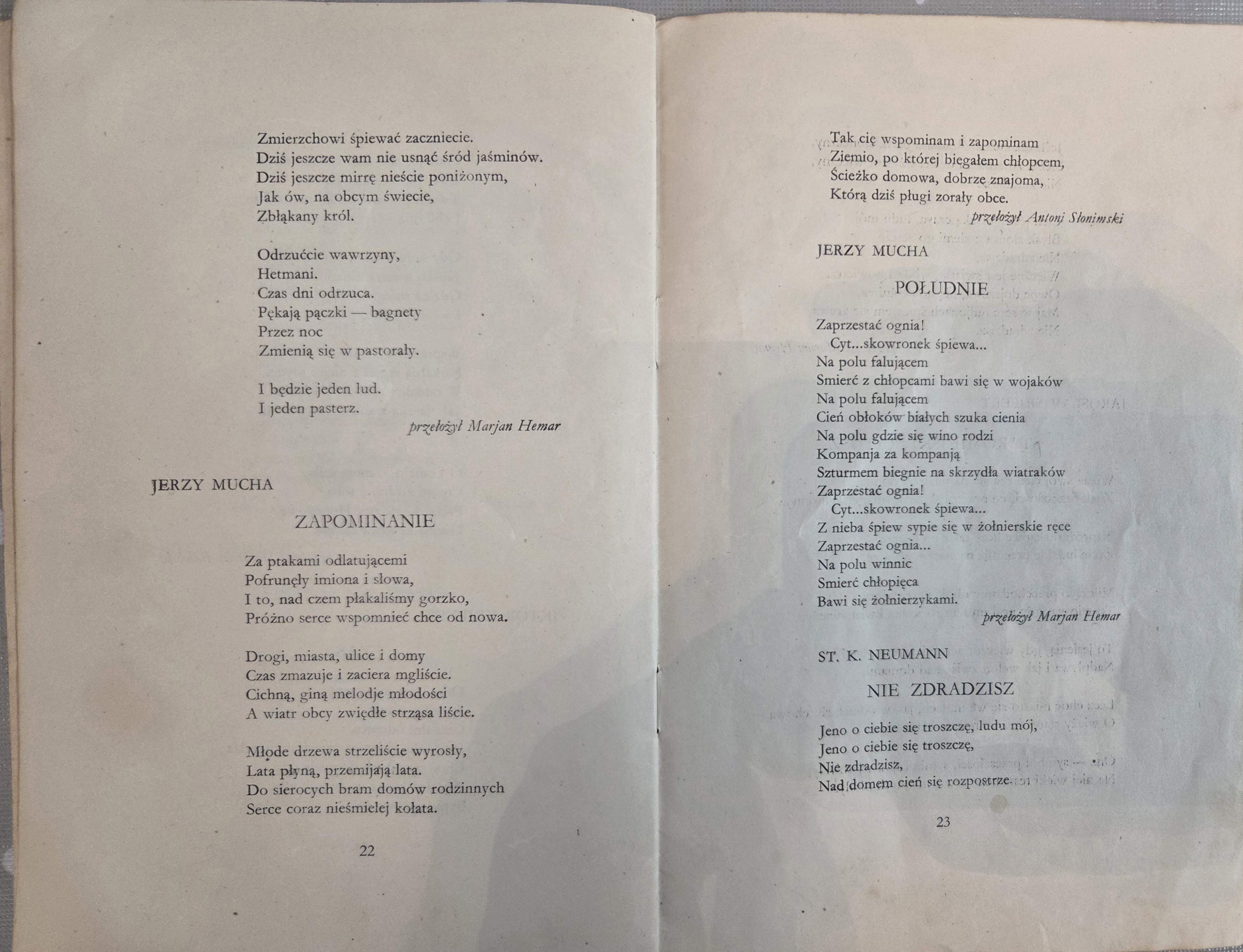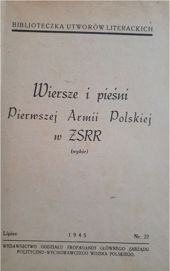 Sięgając po te teksty i przegryzając się przez nie niczym mól książkowy, odkryłam nie tylko nieznane dotąd utwory, ale także znajome nazwiska. Oto w broszurach Oddziału Propagandy Głównego Zarządu Polityczno-Wychowawczego Wojska Polskiego z lipca 1945 roku natrafiłam na wiersze Leona Pasternaka i Jerzego Putramenta. Utwory takie jak Oka i Toast musiałam recytować podczas szkolnych akademii. Z kolei marsz autorstwa Adama Ważyka do dziś brzmi mi w uszach.