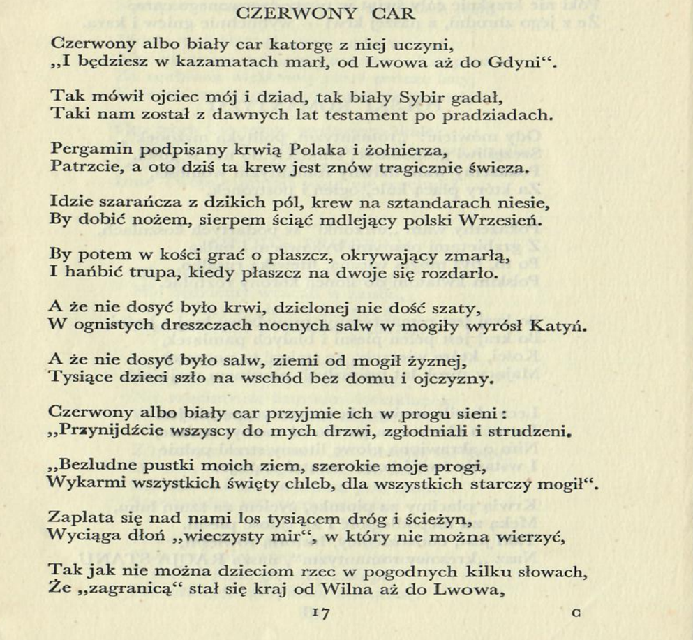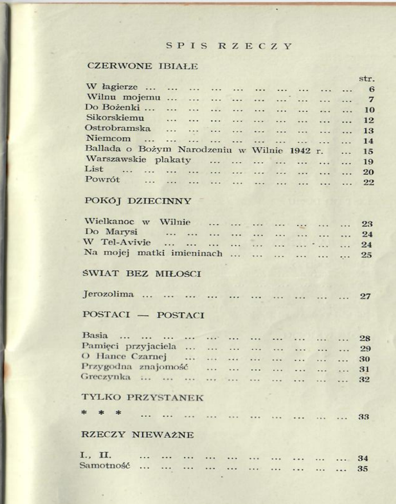 Czerwone i białe – te wiersze poświęcone są pamięci utraconego Wilna i dramatowi życia w obozach. Wilno jawi się tu jako symbol rodzinnego ciepła i szczęścia, nieodwołalnie utraconego.