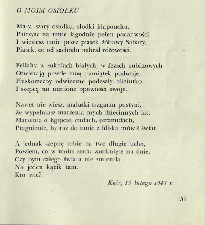 Razem z nimi, po amnestii z sierpnia 1941 roku, zaciągnęłam się do armii gen. Andersa, by przejść szlak z Buzułuku nad Samarą przez Persję, Irak, Palestynę i Egipt aż do Turcji. Walczyłam pod Tobrukiem i Monte Cassino, widząc śmierć i zniszczenie, ale także cywilną tułaczkę.