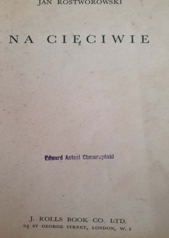 Na wielu tomikach widnieje kolorowa pieczątka „ Księgozbiór Ewd. A. Chmurzyńskiego. ( Foto nr 1, pieczątka w książce Jana Roztworowskiego, Na Cięciwie)